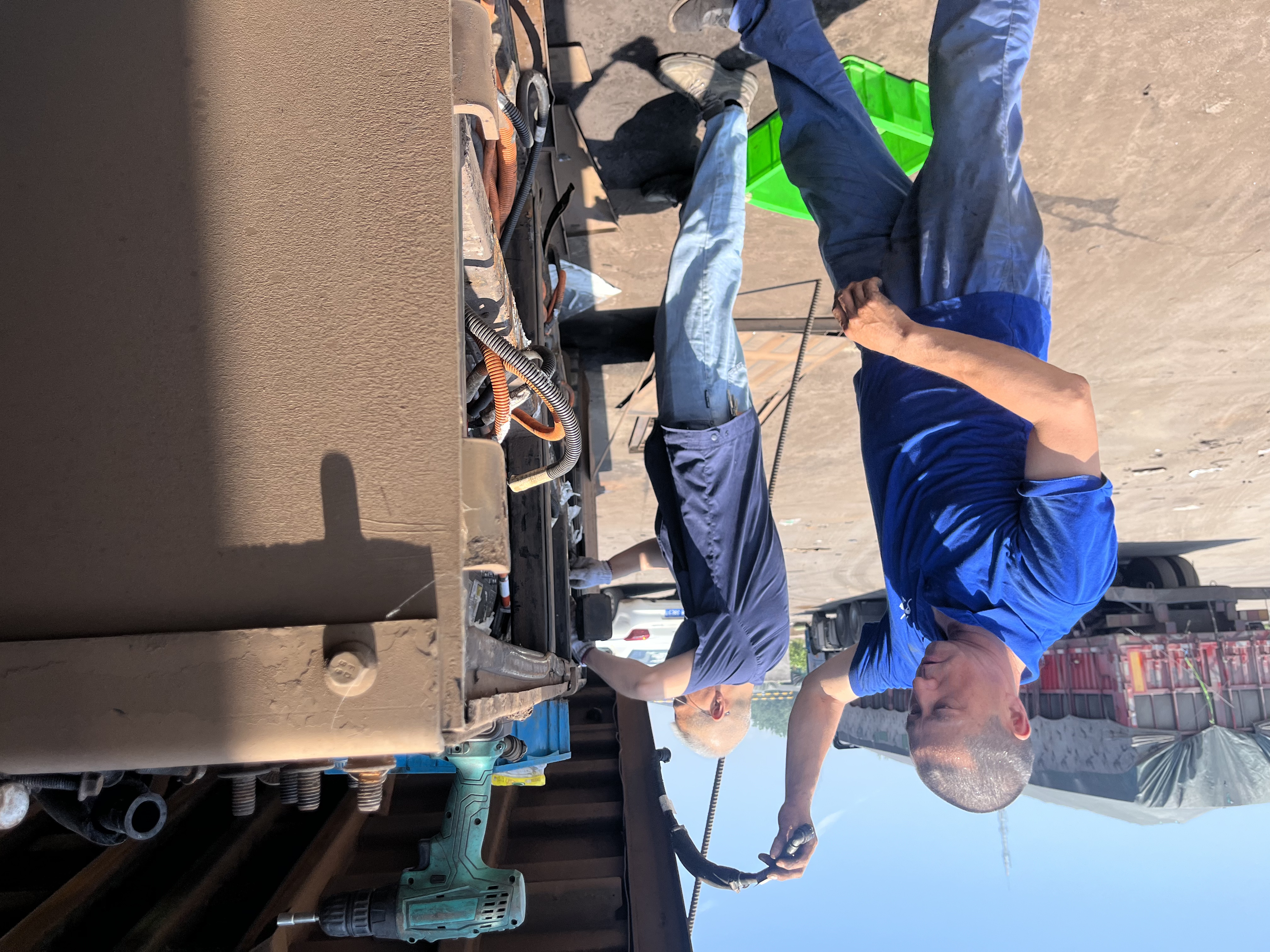 面對緊急任務,7月6日,328國道旁,揚汽集團修理廠黨員先鋒突擊隊迅速集結(jié)投入搶修。引擎蓋下熱浪撲面,地面蒸騰暑氣上涌,隊員們蹲伏在狹窄的車底空間緊張操作。皮膚被烈日灼得通紅刺痛,他們也只是簡單處理片刻,便又馬不停蹄地投入到下一項工作中。這只是近期高溫“烤”驗下的縮影。在修理廠各個角落:在露天的狹窄空間里安裝新能源渣土車護板;深入高郵鋼鐵廠悶熱的環(huán)境搶修礦卡;進行戶外焊接時,直面滾燙金屬散發(fā)出的陣陣灼人熱浪……